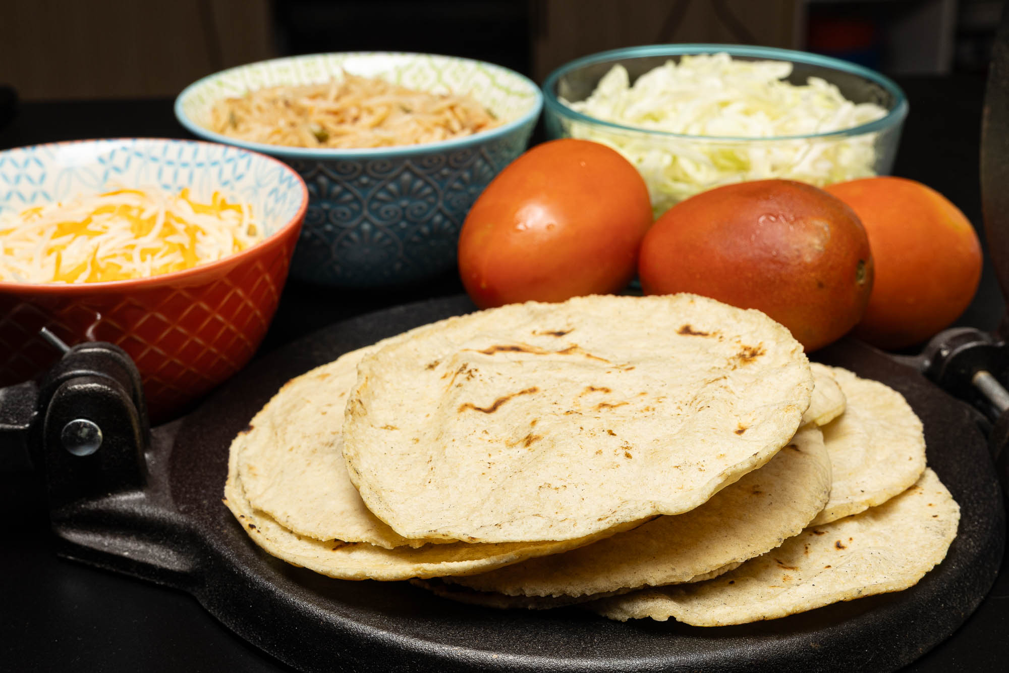 Store-bought tortillas are full of preservatives and other garbage. I looked at Mission tortillas, and there were 11 ingredients. Quite different from a fresh, home-made, 3-ingredient, garbage-free tortilla hot off the pan. So good.